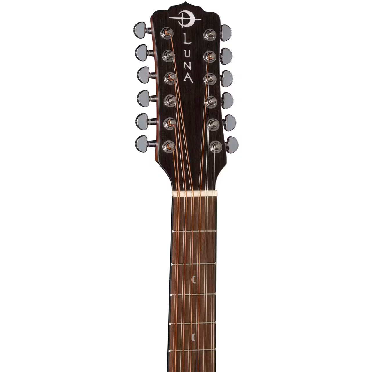 Expanding on the popular Vintage Series, the 12 String Vintage Dreadnought Cutaway acoustic guitar adds a richer tonal variety to the line. Easily amplify your sound and dial it in quickly with the onboard Fishman Presys II preamp system with onboard tuner. From the vintage distressed brownburst finish to the brushed nickel open gear tuners, the 12-String Art Vintage Dreadnought Cutaway will stand out on any stage with its distinctive rustic look and solid-built construction. Its distinct looks include cream multi-ply body binding and signature moon phase inlays. Musicians can expect full warm yet vibrant tone from the strong eastern mahogany body and solid spruce top. The most common 12-String tuning is E3E2A3A2D4D3G4G3B3B3E4E4 – theres a good chance youll see one of these on the Grand Ole Opry stage! Join the Luna Tribe!