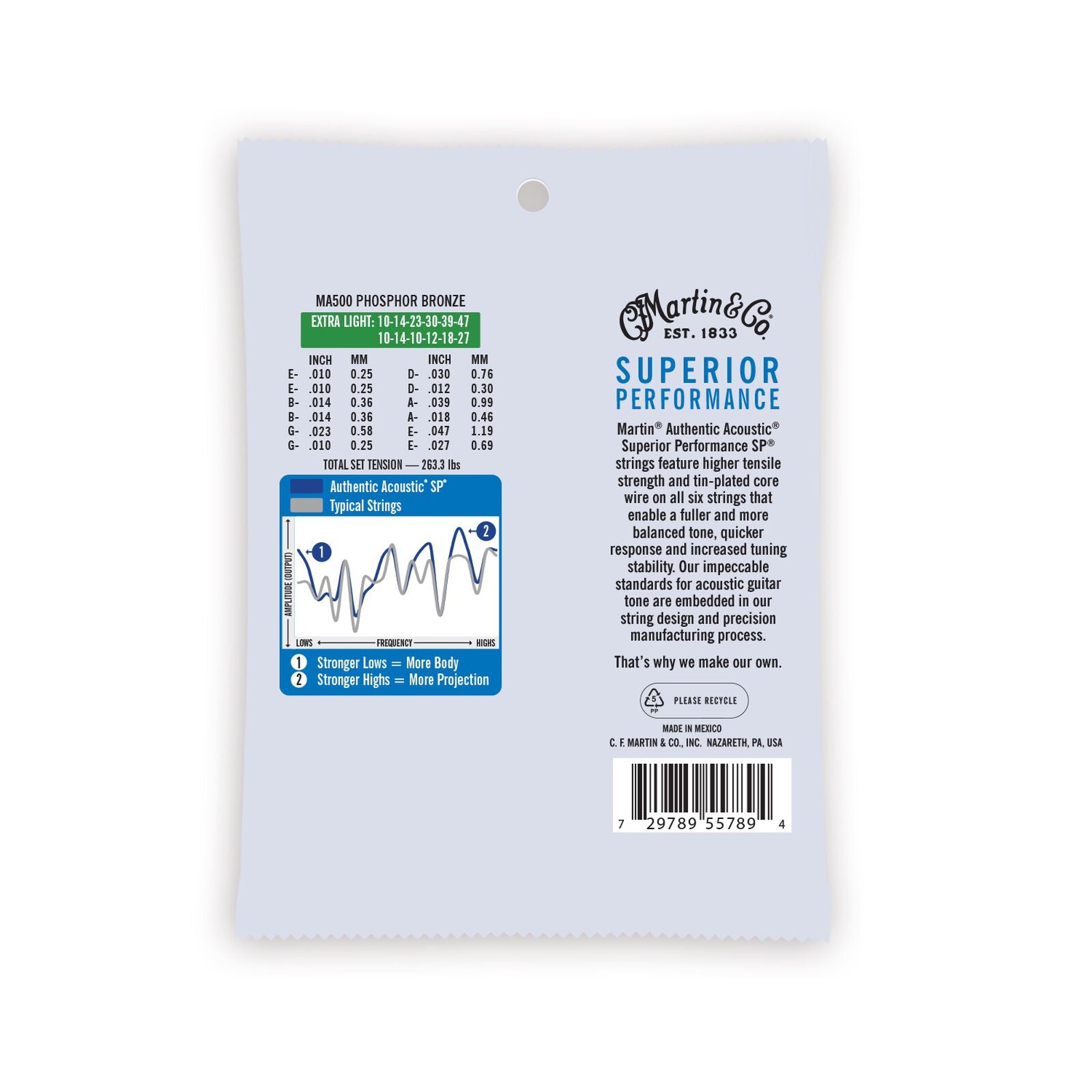 Martin® Authentic Acoustic® Superior Performance SP® strings feature higher tensile strength and tin-plated core wire on all six strings that enable a fuller and more balanced tone, quicker response and increased tuning stability. Our impeccable standards for acoustic guitar tone are embedded in our string design and precision manufacturing process. That's why we make our own.