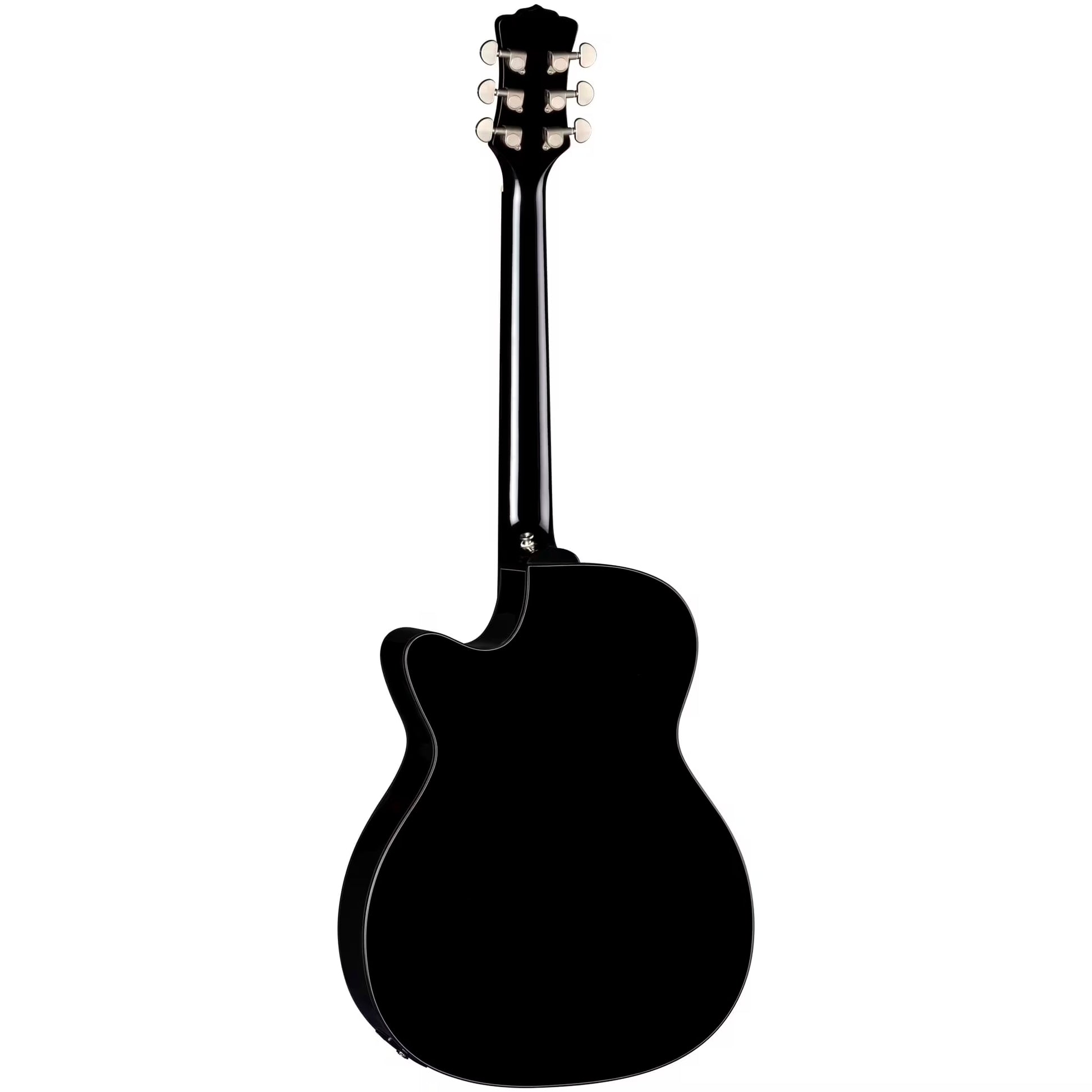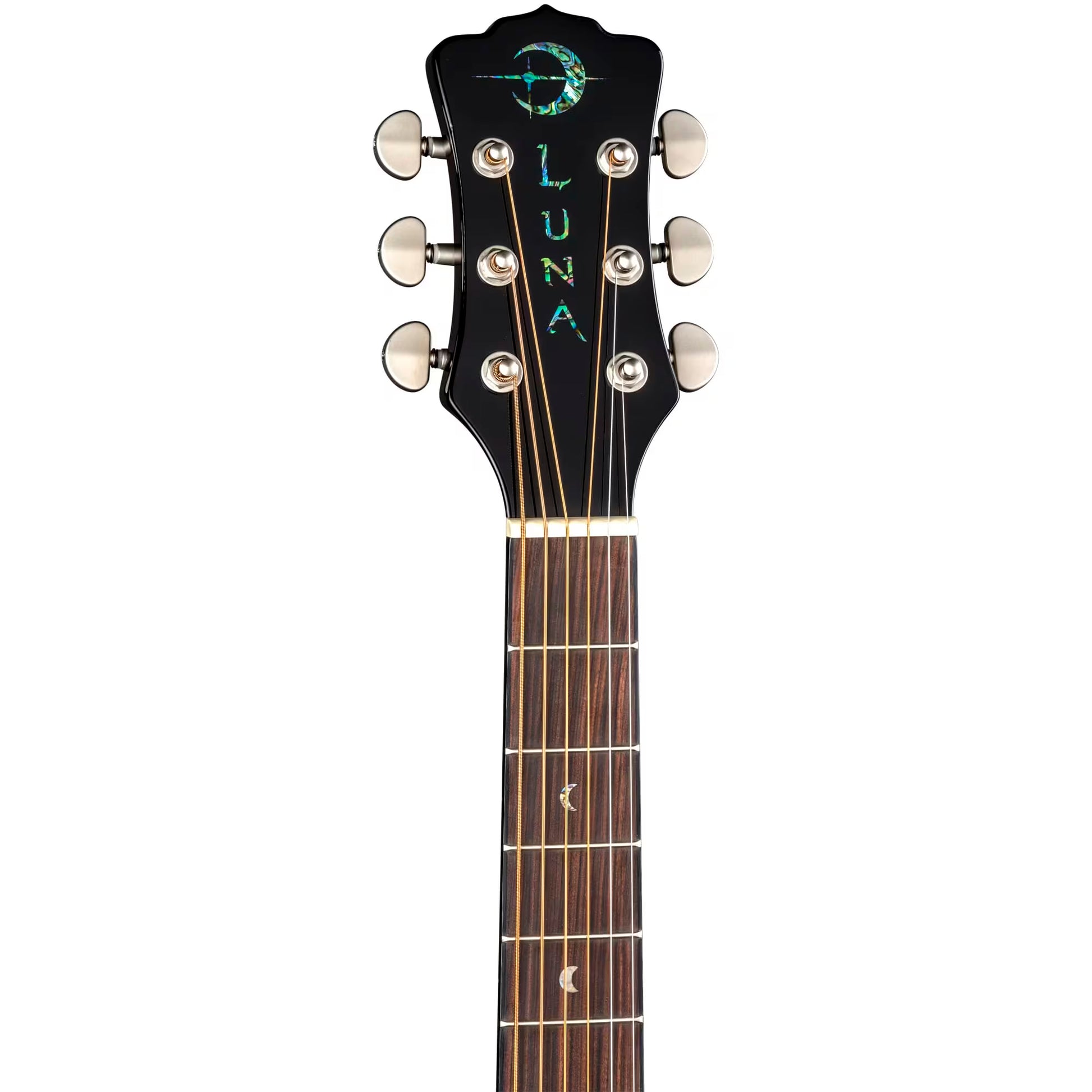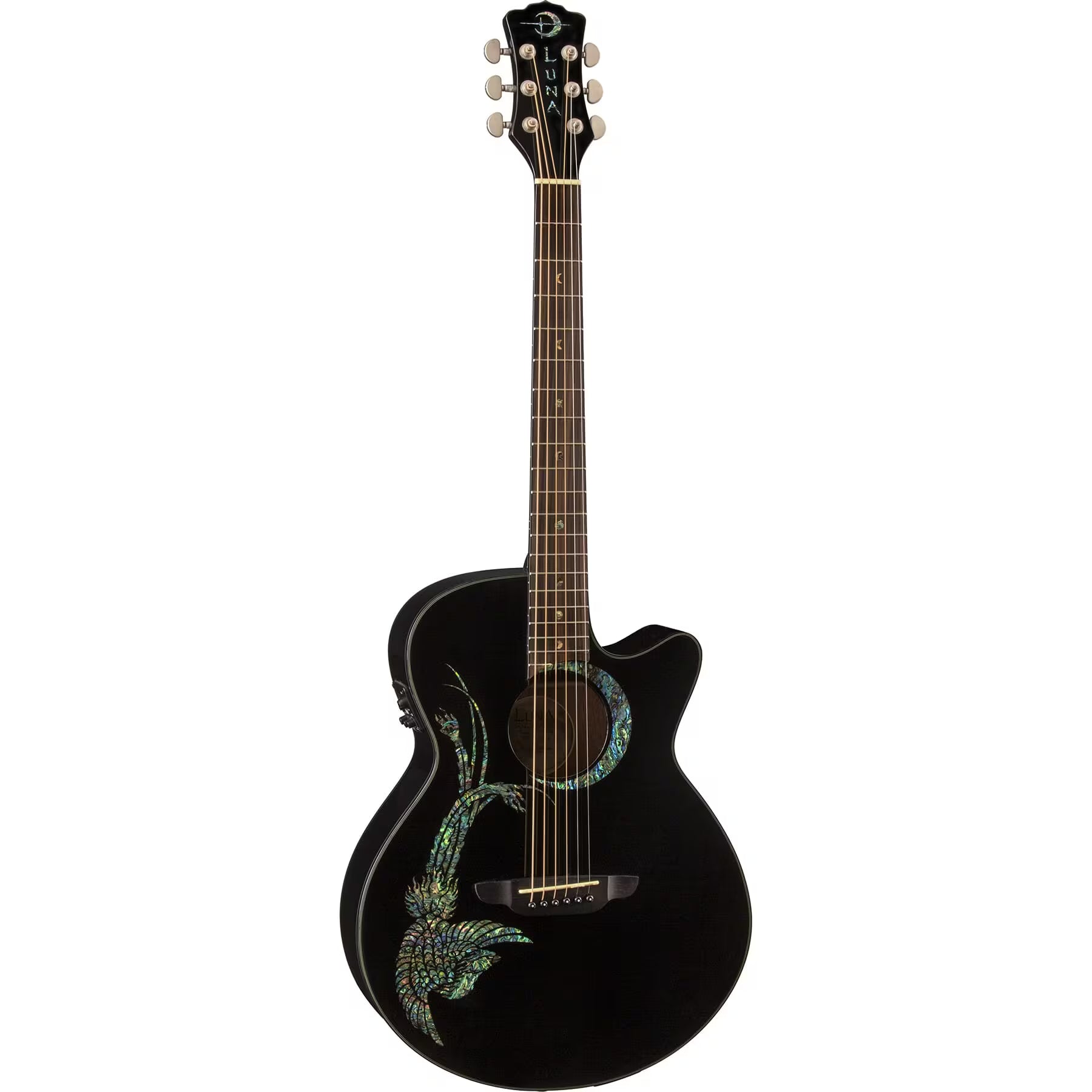 The Fauna Dragon Folk Acoustic-Electric Guitar has a downsized jumbo cutaway body that is comfortably contoured to fit any musician. The Fauna Dragon has a select spruce top for a full range of sound, and the sides and back are crafted of eastern mahogany. The elegant pau ferro over mahogany neck has a slender profile that puts even challenging notes and chords within easy reach. The Dragon features Lunaβs gently curved headstock with a signature crescent moon logo inlaid in sparkling abalone. Matte nickel die-cast tuners provide smooth and precise adjustment. When your mood turns electric the preamp has more than enough power for any setting. The equalizer lets you shape your sound just the way you like it, and a built-in electronic tuner that makes it easy to keep tones true and on-key. A rich abalone Dragon inlay arches powerfully across the guitarβs raven finish, making this instrument an attention-getter. Other Luna signature accents include a crescent moon inlaid in abalone around the sound hole, inlaid abalone crescent moon logo on the headstock, and exclusive moon phase fretboard markers inlaid in abalone. The Fauna Dragon β for the player whoβs ready to make an unforgettable musical statement. Case sold separately.