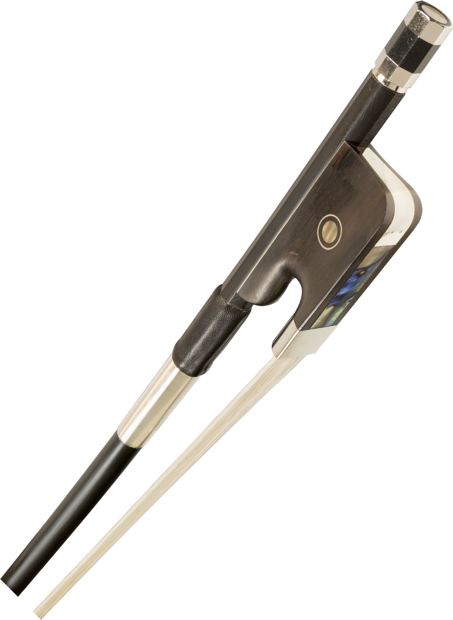 Black fiberglass stick with wire grip, fully lined ebony frog with Parisian eye, and three-part button