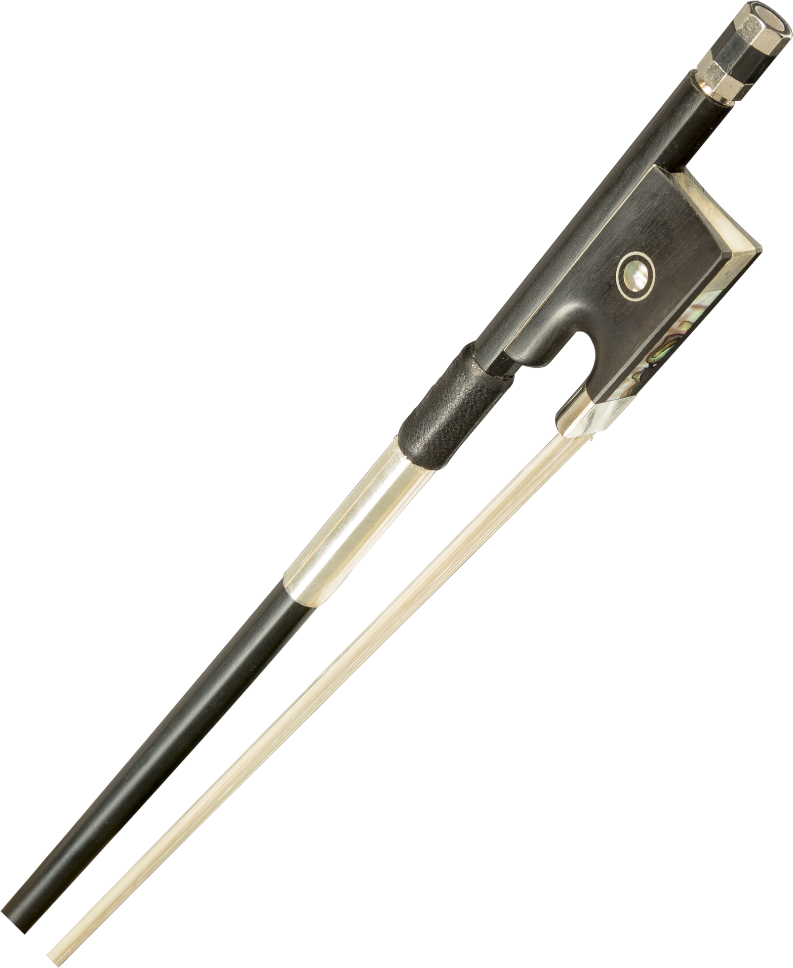 Black fiberglass stick with wire grip, fully lined ebony frog with Parisian eye, and three-part button.