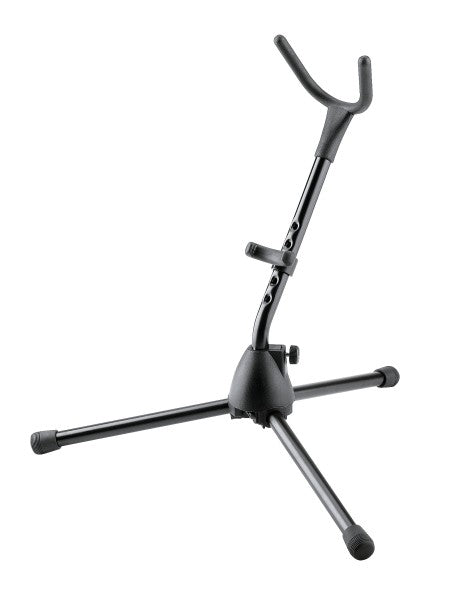 Adjustable folding stand for Eb Alto and Bb Tenor Sax. Fiberglass reinforced plastic base. Flexible upper support arm for different bell sizes. Lower support arm bracket with several vertical locking positions. All instrument support parts covered with exclusive non-marring plastic coating.