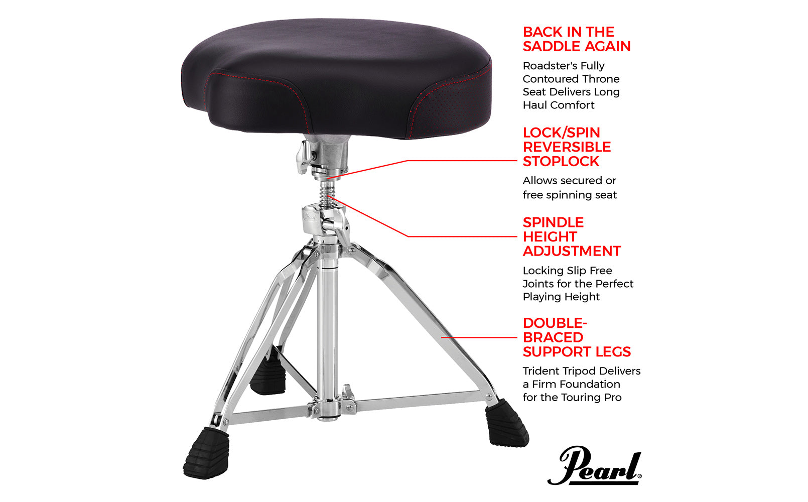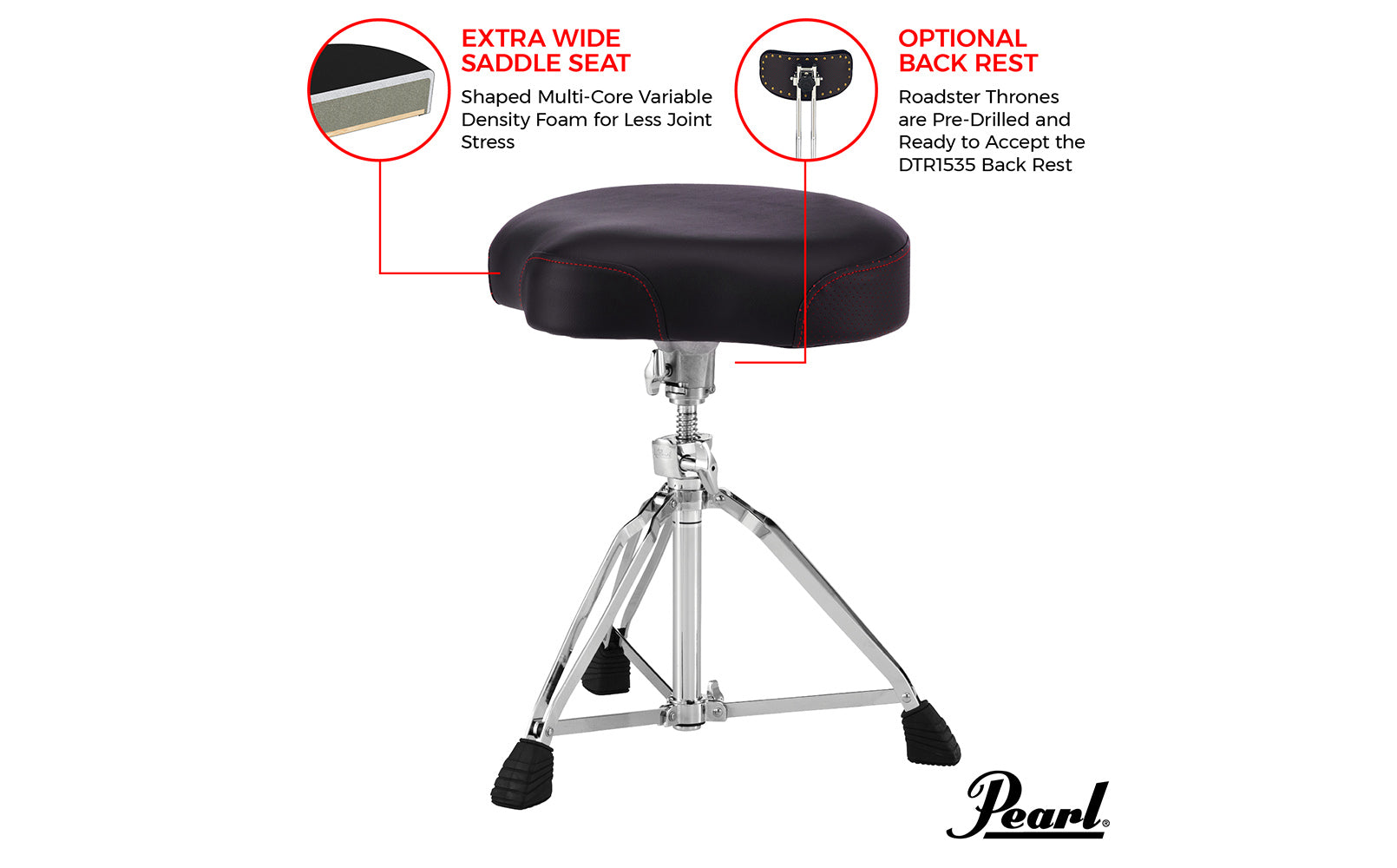 Essential for extended and efficient performance, Pearl Roadster thrones feature advanced ergonomic design and a selection of computer-tempered cushion tops to provide support and ease joint pressure during long sessions. The D3500 is a saddle-style throne featuring a Multi-Core Foam seat with multiple layers of varied-density foam for better playing and an improved feel. It accepts Pearl's optional DTBR1535 backrest detachable backrest, and its durable tripod includes Pearl's exclusive Lock/Spin System, allowing the cushion to be secured in place or free spinning depending on preference.