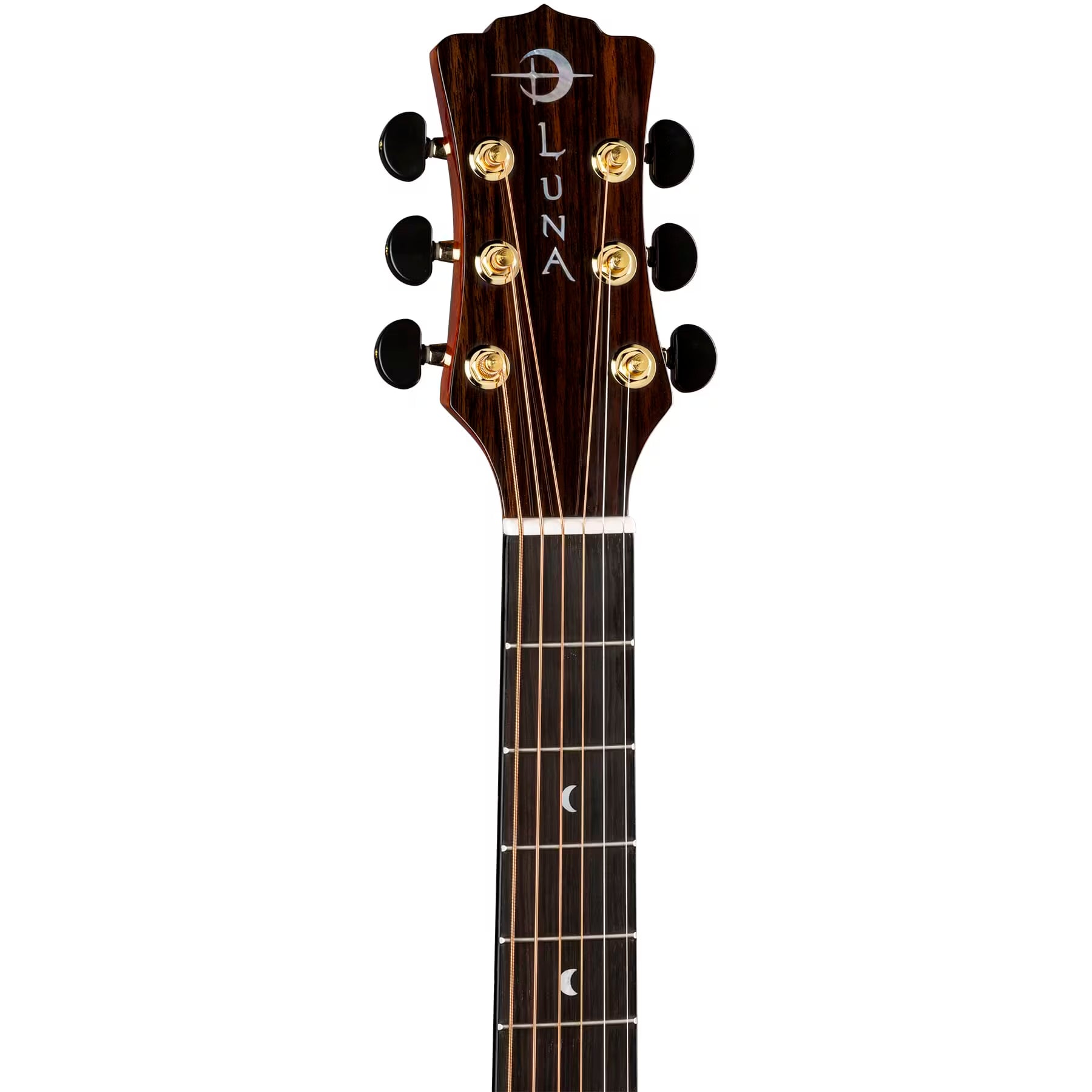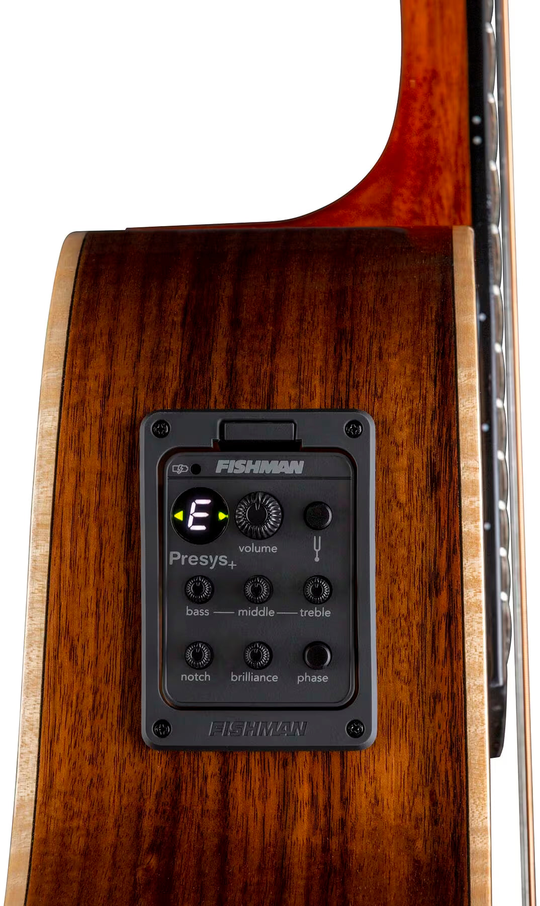 Handmade from a combination of Lacewood, Mother of Pearl, Padauk, Burled Maple, Teal Abalone, Spalted Maple, Quilt Sapele, Koa and Blackwood, this model paints a unique picture of an equestrian scene in the wild. A horse on its hindlegs has a vision in mind and place to go. The Vista Series blends the world of fine art and the art of advanced acoustic guitar building. The Vista Stallion acoustic-electric guitar displays a skillfully crafted top made from attractive tone-woods on a Grand Concert Cutaway Body including back and sides koa and an ebony fretboard. Once plugged in, the Vista Stallion takes off in yet another sonic direction. Owing to a Fishman Presys+ (PSY-201) preamp with built-tuner, this model offers clear, strong, natural acoustic sound on stage even when going against dense instrumentation. Whether plugged-in or not, the Vista series exerts incredibly full tone, pristine clarity, and unique visual presence make it the ideal instrument to make your musical statement. Paisley hardshell case included.